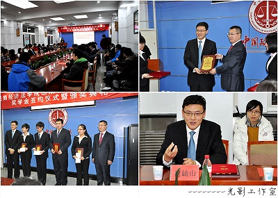、岳成律师事务所设立奖教金、奖学金的合约,为第一届奖教金获得者易军和刘智慧老师、奖学金获得者朱进姝、钟久星、刘贺元、李福慧等四位同学颁发荣誉证书和奖教金、奖学金。av在线
